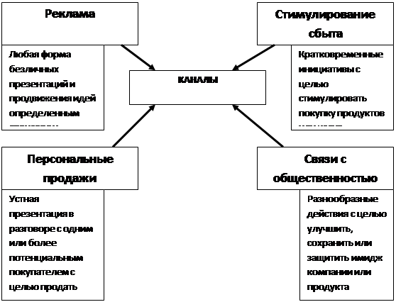 | Реклама | Стимулирование сбыта | Связи с общественностью | Персональная продажа |