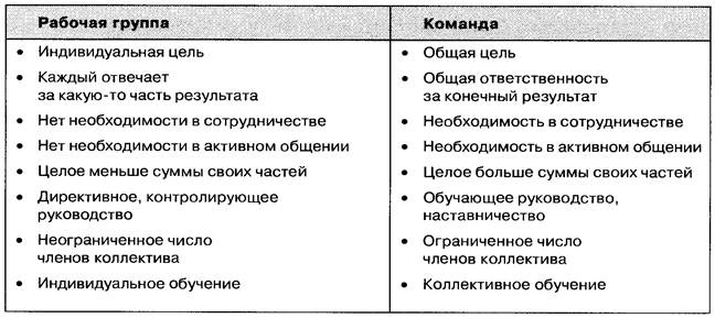 Выделенные Такманом и Йенсеном стадии развития команды (их можно также назвать формирование, притирка, выработка норм и эффективная работа), весьма полезные для понима-ния проблем повышения эффективности командной работы, складываются в единый последовательный процесс. Однако в действительности развитие команды чаще всего имеет характер цикла, в котором фазы формирования, хаоса, стабилизации и прогресса предстают в несколько ином виде. Внешние условия и состав команды на самом деле непрерывно меняются, и это, естественно, отражается на процессе ее развития. Кроме того, после этапа прогресса, на котором люди уже опираются на достигнутые успехи, члены команды обычно расслабляются и их эффективность падает. Наставник должен уметь распознавать моменты стагнации, когда напряжение в группе нарастает, и добиваться, чтобы группа перешла к новому этапу. Здесь необходимо обратить внимание и на такие негативные явления в коллективе, как манипулирование результатами, страх и недоверие, нежелание работать, борьба за власть. Эти проблемы можно решить путем повышения взаимного доверия, принятия кодекса поведения, организации спонтанной обратной связи, развития неформального общения и более активного участия в работе всех членов команды. Важно также помнить, что не следует путать рабочую группу с командой, хотя на практике именно так обычно и бывает. Важнейшие различия между этими двумя понятиями показаны в таблице.
