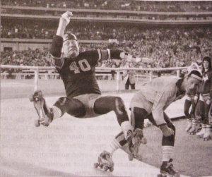 Подпись к этому снимку, появившемуся в журнале «Life» в 1973 г., гласила: «В Нью–Йорке падение становится проявлением грации. Глаза вылезают из орбит, восемь колес и десять пальцев загребают воздух. Чарли О'Коннел из «Сан–Франциско Бэй Бомбер» принимает такую фантастическую позу, принять которую боится самый отчаянный участник гонок на роликовых коньках «Роллер Дерби». Еще свежо в памяти его столкновение с Биллом Гроллом из «Нью–Йорк Чифс» на чемпионате мира в минувшем мае. В результате О'Коннел и его команда выбыли из борьбы».