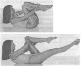 4. Теперь положите левую руку на внешнюю сторону левой ноги, а правую – на внутреннюю сторону левого колена. Выдыхая, убедитесь, что живот подтянут к позвоночнику, и вытягивайте правую ногу, поворачивая ее носком наружу в тазобедренном суставе. Вдыхая полной грудью, согните ногу обратно к груди и обхватите правой рукой.