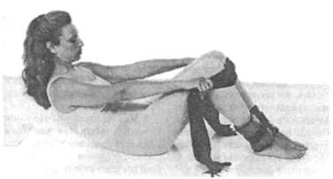 Сядьте на пол, согнув ноги в коленях. Ступни вместе. Ноги чуть ниже колен обхватите шарфом. На лодыжки прикрепите отягощения. Под голову положите подушку.