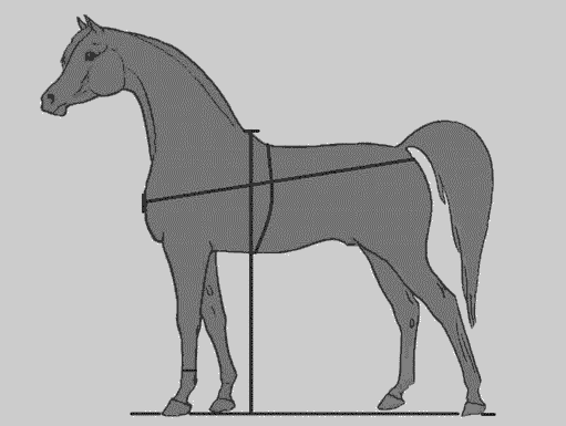 Длину туловища определяют измерительной палкой по расстоянию от переднего выступа плеча - лопаточного сочленения до задней точки седалищного бугра. От соотношения высоты в холке и длины туловища зависит "формат" лошади, который может быть в виде стоячего прямоугольника, квадрата или лежачего прямоугольника.