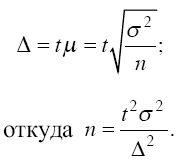 Уменьшение стандартной ошибки выборки, а следовательно, увеличение точности оценки всегда связано с увеличением объема выборки, поэтому уже на стадии организации выборочного наблюдения приходится решать вопрос о том, каков должен быть объем выборочной совокупности, чтобы была обеспечена требуемая точность результатов наблюдений. Расчет необходимого объема выборки строится с помощью формул, выведенных из формул предельных ошибок выборки (Δ), соответствующих тому или иному виду и способу отбора. Так, для случайного повторного объема выборки (n) имеем: