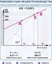 Равновесный объем производства (выпуска) - это такой объем производства, при котором совокупное предложение равно совокупному спросу, или это объем производства, обеспечивающий расходы, достаточные для закупки данного объема производства.AS (GDP) = Y = AD Расчет - кейнсианский крест. Это способ с применением биссектрисы, то есть линии под углом 450 Особенность этой прямой состоит в том, что любая точка на ней предполагает равенство значений переменных, расположенных на горизонтальной и вертикальной осях координат. В точке пересечения линии совокупного спроса с биссектрисой и будет определен равновесный объем производства, так как именно этому объему соответствует такой же уровень совокупного спроса. Это точка Е - равновесие. Равенство выпуска и совокупных расходов в точке Е выполняется.