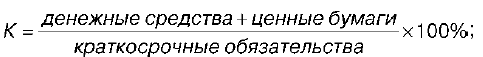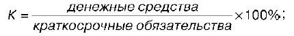 2) коэффициент абсолютной ликвидности, характеризующий, какая часть краткосрочных обязательств может быть погашена на конкретную дату только за счет денежных средств на счетах предприятия (рекомендуемое значение от 10 до 30 %):