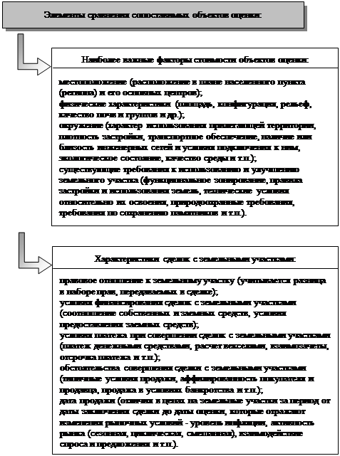 К элементам сравнения относятся факторы стоимости объекта оценки (факторы, изменение которых влияет на рыночную стоимость объекта оценки) и сложившиеся на рынке характеристики сделок с земельными участками. Наиболее важные факторы стоимости и характеристики сделок с земельными участками приведены на рис.12.1.
