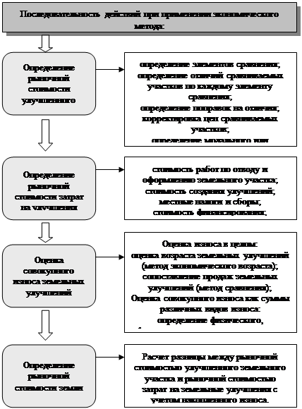 · расчет рыночной стоимости земли как разницы между рыночной стоимостью оцениваемого земельного участка и рыночной стоимостью затрат на земельные улучшения.