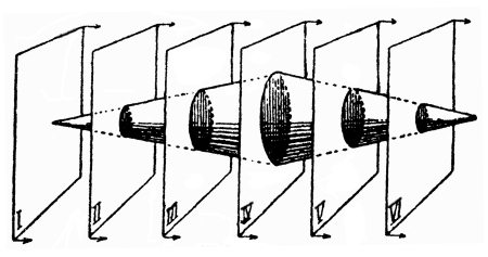 Рассмотрим еще пример. Двухмерный мир (плоскость), двигаясь в трехмерном пространстве, наткнулся на тело в форме двойного конуса (см. рис.). Двухмерный обитатель плоскости, конечно, не может воспринять этот конус как тело; не может даже и вообразить его себе. Что же будет он видеть и думать, когда мир его наткнется на подобное трехмерное тело, и оно пройдет сквозь плоский мир? Проследим за этим. Сначала в двухмерном мире появится точка – вершина конуса. Затем, по мере дальнейшего продвижения плоского мира в направлении третьего измерения (т. е. «с течением времени», как сказал бы двухмерный мыслитель), точка превратится в небольшой кружок или эллипс – сечение конуса плоскостью двухмерного мира. Кружок будет расти, расширяться и, достигнув наибольшего размера, станет сокращаться, постепенно превратится в точку и вновь исчезнет. Двухмерный исследователь наблюдал историю зарождения, развития, увядания и исчезновения «кружка», между тем как мы, существа трехмерные, воспринимаем ту же вещь сразу, одновременно в трех измерениях. Для них он существовал в ряде последовательно воспринимаемых плоских сечений, для нас – весь целиком, как трехмерное тело. Движение плоскости в третьем измерении знакомого нам пространства переживается двухмерным существом как течение времени. Для него «прошедшее» конуса – это те его части, которые лежат по одну сторону его плоского мира (по ту, откуда плоскость движется); «будущее» конуса – те его части, которые расположены по другую сторону, а «настоящее» – пересечение конуса с двухмерным миром.