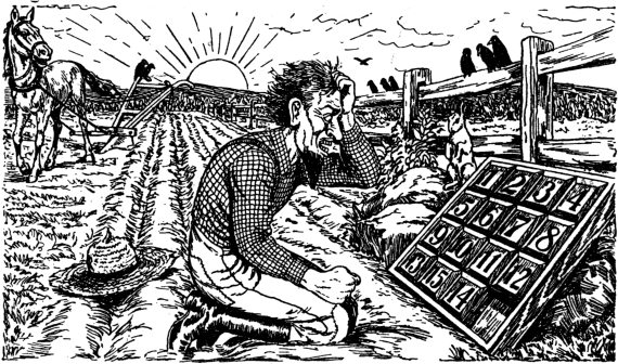 Около полувека назад – в конце 70‑х годов – вынырнула в Соединенных Штатах одна игра, «игра в 15»; она быстро распространилась по всему цивилизованному миру и, благодаря несчетному числу усердных игроков, которых она заполонила, превратилась в настоящее общественное бедствие, в истинный бич человечества. Заглавный рисунок, заимствуемый из одного американского сочинения, изображает эту игру: коробку с 15 шашками, перенумерованными от 1 до 15, и одним свободным полем. Перед ящиком мы видим жертву игорной страсти, одного из многочисленных одержимых этой манией; в разгар полевых работ он, поддавшись внезапно приступу игорной лихорадки, кинулся на колени перед демоном, которому поклонялся. Растерянность видна во всей его фигуре, во всех его чертах; лицо искажено отчаянием; правая рука нервно сжата в кулак; левая рука и наморщенный лоб охвачены судорогой. Кожа головы, после ряда усилий, скинула шляпу; волосы дико растрепаны. Забыт труд, покинуты лошадь и плуг; на нем уселась пара птиц; даже заяц, обычно столь пугливый, сознает, что этот потерянный для мира маньяк, всецело погруженный в 15 шашек своей коробки, не представляет для него ни малейшей опасности.