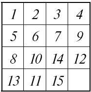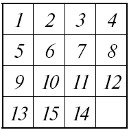 Первый ряд шашек в порядке, как и второй, за исключением последней шашки (9). Эта шашка занимает место, которое в «нормальном» расположении принадлежит 8. Шашка 9 стоит, значит, «ранее» шашки 8; такое упреждение нормального порядка будем называть «инверсией». О шашке 9 мы скажем: здесь имеет место «одна инверсия». Рассматривая дальнейшие шашки, обнаруживаем упреждение для шашки 14; она поставлена на три места (шашек 12, 13, 11) ранее своего нормального положения; здесь у нас 3 инверсии (14 ранее 12; 14 ранее 13; 14 ранее 11). Всего мы насчитали уже 1 + 3 = 4 инверсии. Далее шашка 12 помещена ранее шашки 11, и точно так же шашка 13 – ранее шашки 11. Это дает еще 2 инверсии. Итого имеем, таким образом, 6 инверсий. Подобным образом для каждого заданного расположения устанавливают «общее число инверсий», освободив предварительно последнее место в правом нижнем углу. Если общее число инверсий, как в рассмотренном случае, четное, то заданное расположение может быть приведено к «нормальному» конечному; другими словами, оно принадлежит к разрешимым. Если же число инверсий нечетное, то данное расположение принадлежит ко второй серии, т. е. к неразрешимым.