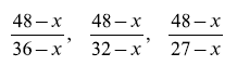 6) Обозначим себестоимость одного арбуза через х. Тогда чистая прибыль от продажи одного арбуза первой партии равна 36 – х, второй 32 – х, третьей 27 – х, наконец, последнего арбуза 48 – х. Так как чистая прибыль от продажи каждой партии одинакова, то число арбузов в первой партии должно равняться