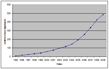 С 1995 по 1999 год, в течение первых четырех лет существования франчайзинга в России, на ее территории возникли 42 франчайзинговые системы, то есть в среднем по 10 новых франшиз в год. С 2000 по 2001 год, за 2 года – количество франшиз почти удвоилось. А только за один 2002 год - появилось 29 новых франшиз. Количество франшизных систем в России в период с 1995 года по 2009 год представлен на рисунке 1.