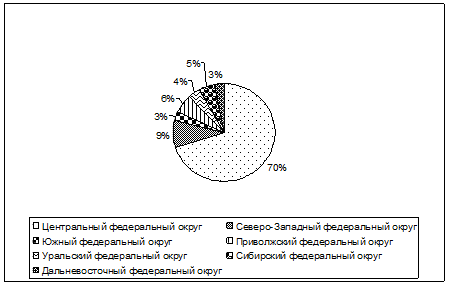 Развитие франчайзинга на территории России происходит неравномерно. К сожалению, на сегодняшний день можно назвать только одного безусловного лидера среди федеральных округов, где франчайзинг используется достаточно широко – это Центральный федеральный округ. Применения франчайзинга в данном округе неразрывно связно с экономическим положением данной территории и уровнем развития бизнеса на рынке. Распределение франшиз в России по федеральным округам представлено на рисунке 8: