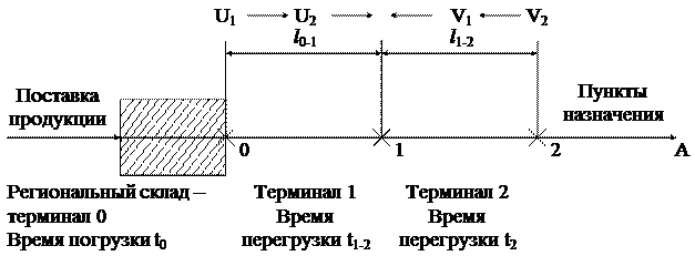 U, V– скорость соответственно груженого и порожнего составов между терминалами (0–1; 1–2); nв – число вагонов, имеющихся на участке между терминалами (0–1; 1–2); qc – грузоподъемность состава (т/состав), эксплуатируемого между терминалами (0 и 1; 1 и 2):