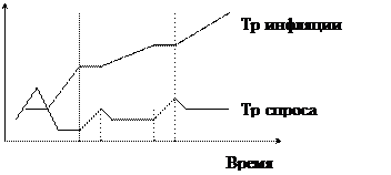 Снижение индивидуального спроса ввиду ухудшения общего экономического положения населения из-за резкого роста инфляции – одна из главных причин и составляющих социально-экономической ситуации в обществе. К невостребованности продукции ведут не только скачки инфляции или ее плавный рост, но и инфляционные ожидания. Опасение роста инфляции приводит к приобретению впрок товаров еще до момента ее роста. Затем же наступает спад спроса и некоторая его стабилизация. Это происходит на этапе роста инфляции. При ее стабилизации спрос увеличивается, но темпы роста спроса отстают от темпов роста инфляции, поскольку индексация доходов населения в процентном отношении ниже роста инфляции. Таким образом образуется площадь, на которой риск невостребованности продукции превращается в реальность (см. площадь между кривыми темпов инфляции и спроса на рис. 5).