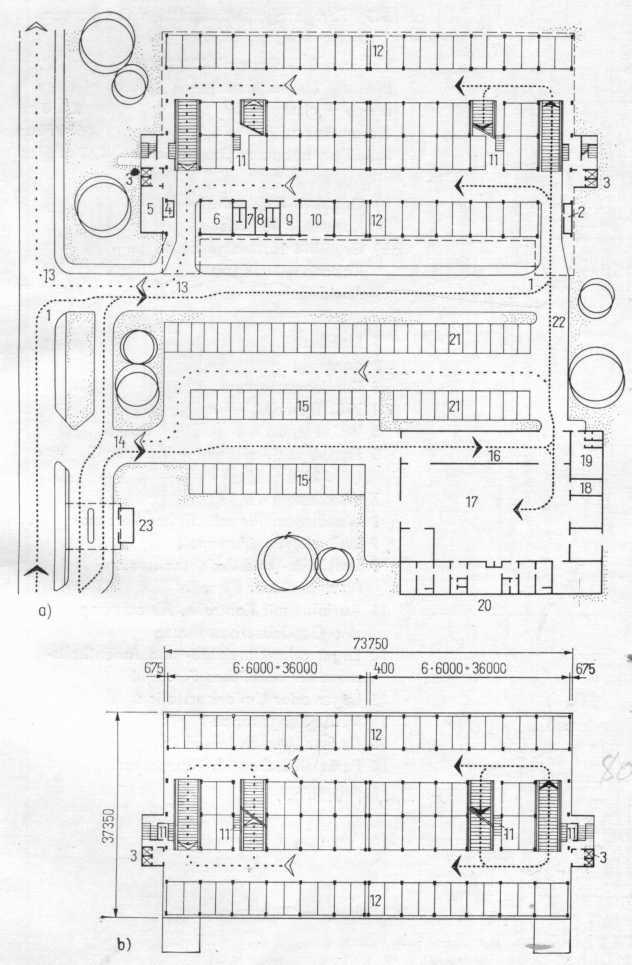 Вназемных многоэтажных гаражах помещения ТО и ТР могут размещаться только на первом и последнем этажах без транзитного движения автомобилей по этажам (при устройстве изолированных рамп.
