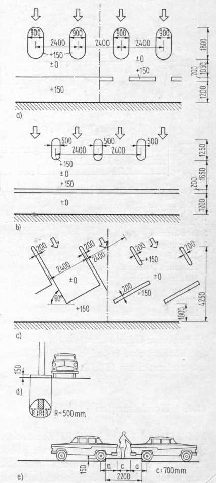 | Рис. 11 Колесоотбойные устройства а) внутренние колесоотбойники под углом 90 ° b) внешние колесоотбойники под углом 90 ° c) внешние колесоотбойники под углом Standwbrkel d) ограничительное кольцо вокруг опоры е) разграничительный тротуар между рядами машин |