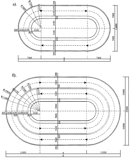 | Рис. 13. Двухпутная криволинейная рампа. Минимальная горизонтальная проекция: а) уклон 10 %; б) уклон 13 %. | Рис. 14. Минимальная горизонтальная проекция прямолинейной полурампы (аппарели). Уклон 10 %. а) однопутной; б) двухпутной |