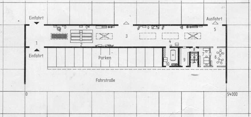 | 1 въезд, регистрация 36 м2 2 мойка 108 м2 3 складское помещение 36 м2 4 смотровое помещение 108 м2 5 выезд 36 м2 6 комната ожидания 22 м2 | 7 офис 16 м2 8 коридор 4 м2 9 приемная 16 м2 10 склад ГСМ 22 м2 11-12 туалеты |