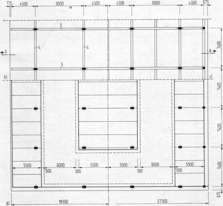 а) разрез, b-c) план плит перекрытия, d) план
