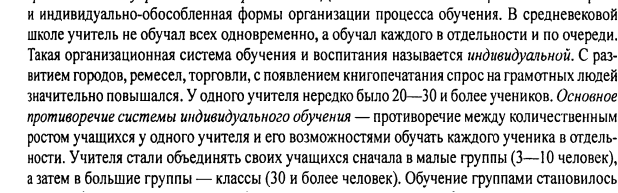 Обучение детей стало массовым. Возникла концепция коллективного обучения. Она впервые была применена в братских школах Белоруссии и Украины (XVI век) и стала зародышем классно-урочной системы обучения. Теоретически эта система была обоснована и широко популяризировалась в XVII веке Яном Амосом Коменским. Описана в книге «Великая дидактика». Он ввел в школах учебный год, разделил учащихся на группы (классы), поделил учебный день на равные отрезки и назвал их уроками. Уроки чередовались с переменами. С методической стороны все уроки выстраивались довольно четко, представляли собой относительно законченное целое. Структурными частями урока были: начало, в течение которого учитель с помощью вопросов побуждал учащихся восстановить в памяти и устно изложить пройденное ранее, продолжение, когда учитель разъяснял новый материал, и окончание, когда учащиеся закрепляли только что услышанный материал и выполняли упражнения. Я. А. Коменский был против домашних заданий. По его мнению, школа — учебная мастерская, следовательно, в ней, а не дома, надо обеспечить успех в учении.