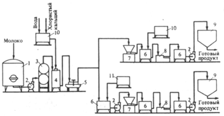 1 – танк для обезжиренного молока; 2 – насос центробежный; 3 – теплообменник; 4 – танк для сыворотки; 5 – насос центробежный; 6 – ванна сырная; 7 – насос для сырного зерна; 8 – отделитель сыворотки (воды); 9 – центрифуга (пресс); 10 – волчок; 11 – сушилка