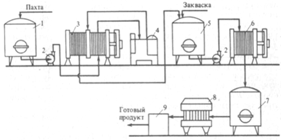 1 – емкость для хранения пахты; 2 – насосы; 3 – пастеризационно-охладительная установка; 4 – гомогенизатор; 5 – емкость для сквашивания; 6 – пластинчатый охладитель; 7 промежуточный резервуар; 8 – машина для розлива продукта в бутылки; 9 – камера хранения готовой продукции