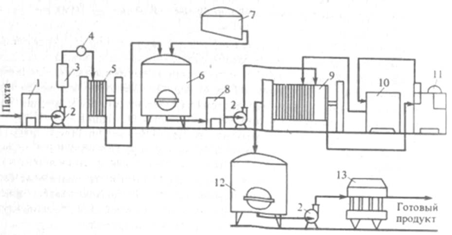 1 – фильтр; 2 – насосы; 3 – отделитель воздуха; 4 – счетчик; 5 – пластинчатый охладитель; 6 – емкость для нормализации пахты по жиру; 7 – емкость для хранения сливок; 8 – уравнительный бак; 9 – пластинчатый теплообменник; 10 – пульт управления; 11 – гомогенизатор; 12 – промежуточный резервуар; 13 – автомат для розлива