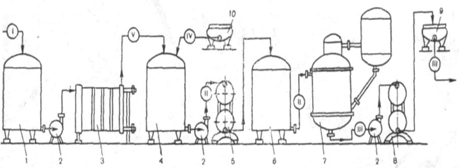 I – сепарированная сыворотка; II – сквашенная сыворотка; III – сыворотка молочная сквашенная сгущенная; IV - закваска; V – пастеризованная сыворотка, охлажденная до температуры сквашивания; 1 – резервуар для приемки сепарированной сыворотки; 2 – насосы; 3 – пластинчатая пастеризационно-охладительная установка ОПЛ-5 или ОПЛ-10; 4 - резервуар для сквашивания сыворотки; 5 – подогреватель ПТ-2, ПТУ-5; или ПТУ-10М; 6 – промежуточный резервуар перед выпарной установкой; 7 – вакуум-выпарная установка; 8 – охладитель ПТ-1 или ПТ-2; 9 – кристаллизатор П-453; 10 заквасочник