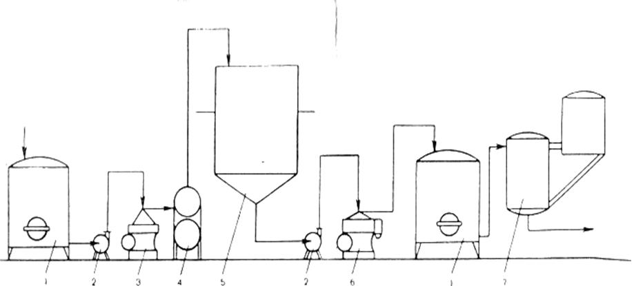 1 – накопительный резервуар; 2 – насос центробежный; 3 – сепаратор для отделения казеиновой пыли и жира; 4 - теплообменник трубчатый; 5 – резервуар для отваривания альбумина; 6 – сепаратор-осветлитель; 7 – вакуум-выпарная установка