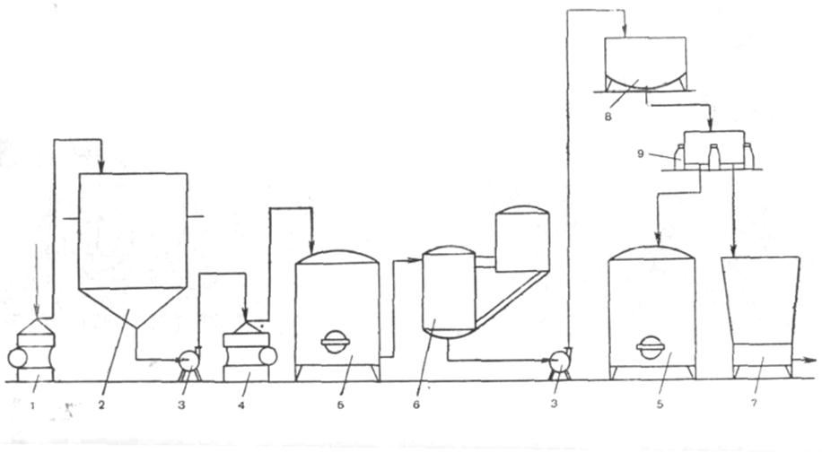 1 – сепаратор для отделения казеиновой пыли и жира; 2 – резервуар для отваривания альбумина; 3 – центробежные насосы; 4 – сепаратор-осветитель; 5 – накопительный резервуар; 6 – вакуум-выпарная установка; 7 – сушилка; 8 - кристаллизатор; 9 - центрифуга