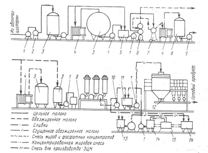 1 – насос; 2 – счетчик для молока; 3, 8 – емкости; 4 – пластинчатый охладитель; 5 – промежуточная емкость; 6 - трубчатый пастеризатор; 7 – сепаратор-сливкоотделитель; 9 – пленочная вакуум-выпарная установка; 10 – насос ротационный; 11, 13, 14 – ванны; 12 – распылительная сушилка; 15 - эмульсор