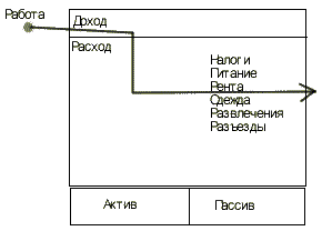 Стрелки в диаграммах показывают течение денег. Цифры сами по себе в действительности значат мало. Как и слова, сами по себе, значат мало. Нужна цельная картинка. В финансовом отчете чтение цифр выводит положение дел. Сразу ясно, как перемещаются деньги. Во многих семьях история с финансами - это история усердной работы с желанием вырваться из заколдованного круга. Деньги-то люди зарабатывают, но всю жизнь приобретают пассив вместо актива.