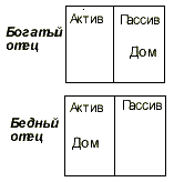 Последующая диаграмма иллюстрирует разницу в восприятии между моим богатым отцом и моим бедным отцом, что до домов. Один отец считал свой дом активом, а другой - пассивом.