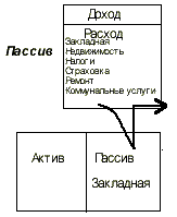 Диаграмма лучше всего демонстрируется возвращением к молодой паре. Т.к. их доходы идут вверх, они решают купить дом своей мечты. Вместе с домом всплывает новый налог - налог на имущество. Затем молодые покупают новую машину, новую мебель, разные приспособления, чтобы обустроить свой дом. Однажды они просыпаются, а в графе пассив - долги по закладной и кредитным карточкам.