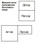 Очень часто люди считают свой дом, сбережения, пенсию составными колонки «актив». Т.к. люди не имеют денег для инвестирования, они и не инвестируют. Это стоит им опыта инвестирования. Большинство так никогда и не становятся так называемыми «искушенными инвесторами». Я не говорю - не покупайте дом! Я говорю: поймите разницу между активом и пассивом. Когда я хочу большой дом, я сначала приобретаю активы, которые станут генерировать денежный поток, чтобы расплачиваться за дом. Финансовое положение моего образования отца лучше всего демонстрирует жизнь того, кто участвует в крысиных гонках. Его расходы всегда шли параллельно доходу, не позволяя инвестировать в капитал. Как результат, его пассив, в который входят закладная и долги по кредитным карточкам, превышает ею активы. Смотрите ниже: