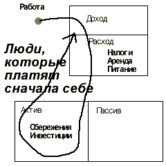 «Почему?» - спросите вы. Ответ вы найдете в книге «Самый богатый человек Вавилона». Дело в силе самодисциплине и силе внутреннего духа, дело в силе воли. Как объяснял мне мой богатый отец, в тот первый месяц, когда я на него работал, большинство людей позволяют миру толкать их со всех сторон. Сборщик долговых обязательств звонит, и вы платите по долгам. Т.е. вы платите, но не себе. Продавец говорит: «Минутку, запишу на ваш счет».
