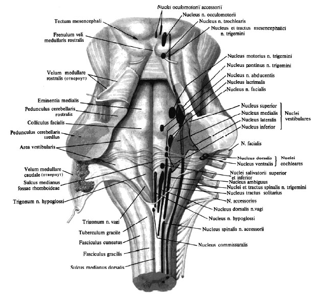Рельеф ромбовидной ямки. Из боковых углублений, recessus lateralis, к середине ромбовидной ямки тянутся белые мозговые (слуховые) полоски, striae medullares (acusticae), разделяющие ее на верхний и нижний треугольники. Продольная срединная борозда, sulcus medianus, разделяет ромбовидную ямку на две симметричные половины. По обеим сторонам от срединной борозды располагается срединное возвышение, eminentia medialis, наружной границей которого является пограничная борозда, sulcus limitans. Сверху и снизу пограничная борозда заканчивается углублениями – верхней и нижней ямками, fovea superior et inferior. Верхняя ямка соответствует месту расположения двигательного ядра тройничного нерва, а снаружи от него проецируется чувствительное ядро этой пары. Здесь находится окрашенное в синеватый цвет голубое пятно, locus coeruleus, которое соответствует латеральной границе ромбовидной ямки. Специфический цвет пятна обусловлен нервными клетками, в цитоплазме которых имеются включения нейромеланина. В верхней части ромбовидной ямки срединное возвышение расширяется и сильнее вдается в полость желудочка в виде округлой формы лицевого бугорка, colliculus facialis. Он образован подлежащим двигательным ядром отводящего нерва и огибающими его волокнами лицевого нерва, латеральнее которого проецируется верхнее слюноотделительное ядро. Книзу срединное возвышение суживается, принимает треугольную форму и получает название треугольника подъязычного нерва, trigonum nervi hypoglossi. Он определяет локализацию ядра XII пары. Снаружи от него лежит сероватого цвета треугольное поле, известное под названием серого крыла, ala cinerea, или треугольника блуждающего нерва, trigonum nervi vagi. Сюда проецируется дорсальное ядро X пары и нижнее слюноотделительное ядро. Между вышеуказанными треугольниками проецируется двигательное ядро IX, X, XI пар ЧМН – двойное ядро (nucl. ambiquus). Кнаружи и выше дорсального ядра лежит проекционное поле ядра одиночного пути, nucl. tractus solitarius, (общее ядро VII, IX и X нервов). Рядом с ним параллельно срединной борозде проецируется спинномозговое ядро тройничного нерва, nucl. nervi trigemini. Наружный отдел ромбовидной ямки, расположенный между пограничной бороздой и входом в боковой карман, называют вестибулярным полем, area vestibularis. Под ним лежат ядра преддверно-улиткового нерва: 2 ядра слухового нерва (вентральное и дорсальное) и 4 ядра преддверного нерва (медиальное – Швальбе, латеральное – Дейтерса, верхнее – Бехтерева и нижнее – Роллера).