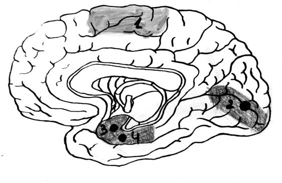 1 – ядро двигательного анализатора; 2 – ядро зрительного анализатора; 3 – ядро обонятельного анализатора; 4 – ядро вкусового анализатора.