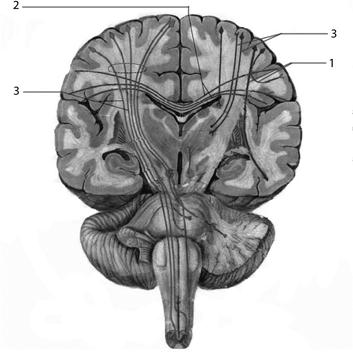 1- ассоциативные, 2 – комиссуральные, 3 – проекционные.