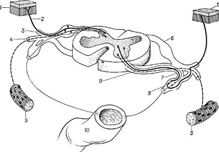 1- кожа, 2- нервные волокна от кожных рецепторов, 3- задняя ветвь, 4- передняя ветвь, 5- скелетная мышца, 6- ганглий заднего корешка, 7- вегетативная ветвь, 8- симпатический ганглий, 9- передний корешок, 10- кишечник.