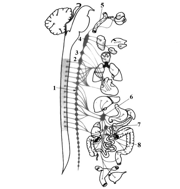 1 – truncus sympathicus; 2 – ganglion cervicothoracicum; 3 – ganglion cervicale medium; 4 – ganglion cervicale superius; 5 – a. carotis interna; 6 – plexus celiacus; 7 – plexus mesentericus superior; 8 – plexus mesentericus inferior.