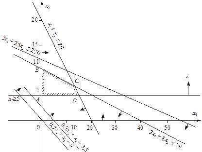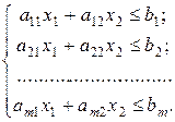 Каждое неравенство этой системы геометрически определяет полуплоскость с предельной прямой ai 1 x 1 + ai 2 x 2 = bi (i =1,2,..., т). Условия неотрицательности переменных определяют полуплоскости с предельными прямыми х 1 = 0 и х 2 = 0. Система совместная, поэтому полуплоскости как выпуклые множества, пересекаясь, образуют общую часть, которая является выпуклым множеством и представляет собой совокупность точек, координаты каждой из которых является решением данной системы (рис.1.1).
