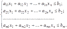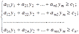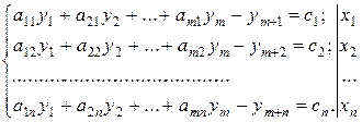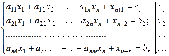 Для решения задач симплексным методом необходимо свести их к канонической форме, для чего у системы ограничений задач (3.9) и (3.10) необходимо ввести соответственно m и n неотъемлемых переменных. Поставим ограничением каждой задачи в соответствие переменные ее двойственной задачи.
