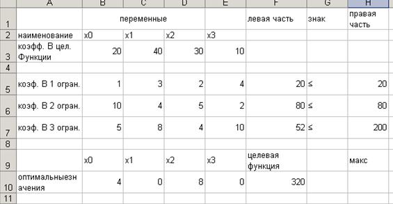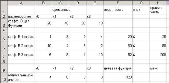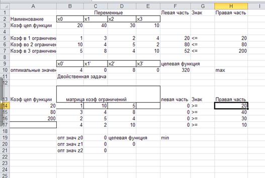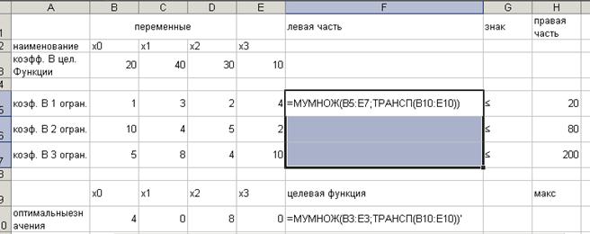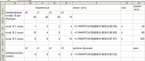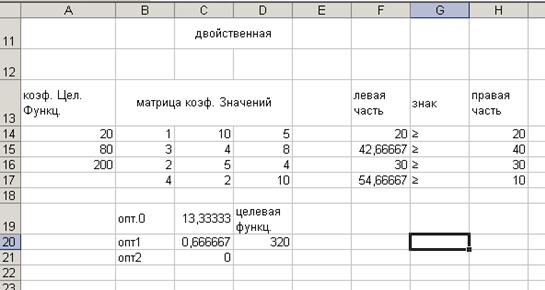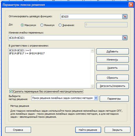 В ячейки F14:F17 вводят формулу =МУМНОЖ(B14:D17;C19:C21), в ячейку D20 вводят формулу =МУМНОЖ(ТРАНСП(A14:A16);C19:C21). Затем запускают Поиск решений.