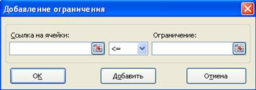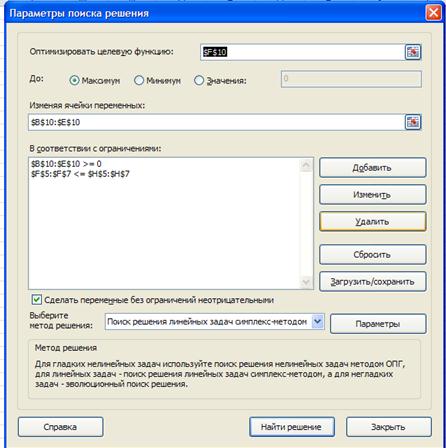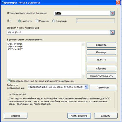 В окне Поиск решений вводим следующую информацию: Целевая ячейка F10 ($ означает абсолютную ссылку, для установки нажимается клавиша F4), Изменяя ячейки B10, С10, D10, E10 (B10:E10), ограничения добавляются нажатием кнопки Добавить при наличии курсора в поле Ограничения.