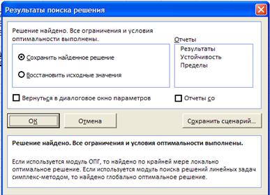 После закрытия окна Параметры нажатием кнопки Ок, нажимается кнопка Выполнить. Выбрать три вида отчета: Результаты, Устойчивость, Пределы.