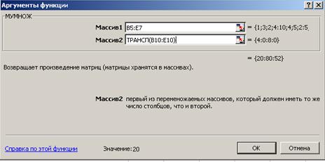 Поскольку функция МУМНОЖ и ТРАНСП работают с массивами, то для их ввода выделяют столько ячеек для результата, сколько ячеек занимает матрица ответа. Перед тем, как закрыть окно ввода таких функций необходим нажать клавишу F2, далее удерживая Ctrl+ Shift нажать Enter.