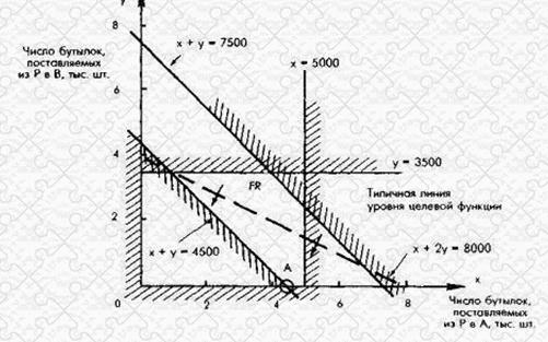 В этой точке х = 4500, а у = 0. Следовательно, оптимальное решение состоит в поставке из Р в А 4500 бутылок, в отсутствии поставок из Р в В, в поставке из Q в А 500 бутылок, а из Q в В — 3500 бутылок. Минимальная стоимость транспортировки для этого решения равна: