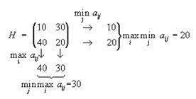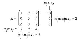Таким образом, исходя из (3), седловой элемент является минимальным в iо-й строке и максимальным в jо-м столбце в матрице А. Отыскание седловой точки матрицы А происходит следующим образом: в матрице А последовательно в каждой строке находят минимальный элемент и проверяют, является ли этот элемент максимальным в своём столбце. Если да, то он и есть седловой элемент, а пара стратегий, ему соответствующая, образует седловую точку. Пара чистых стратегий